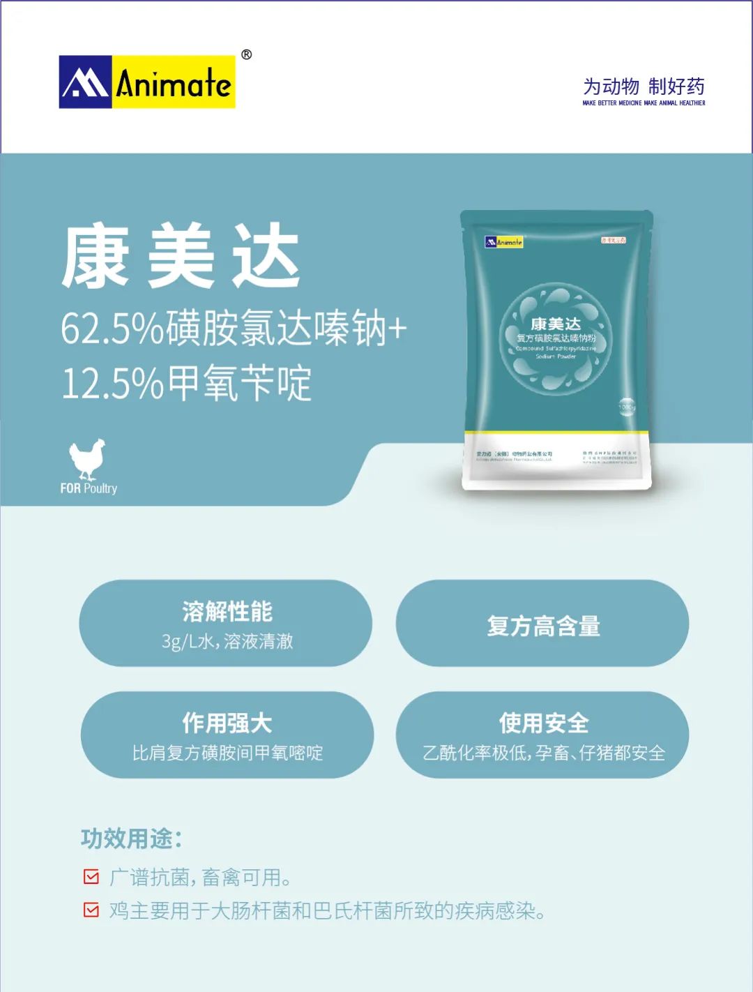 鸡主要用于大肠杆菌和巴氏杆菌所致的疾病感染。
