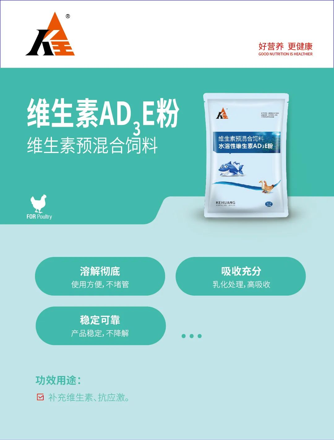 脂溶性维生素经过特殊处理,完全溶于水,不会产生沉淀和堵管,可经过水线饮水添加。